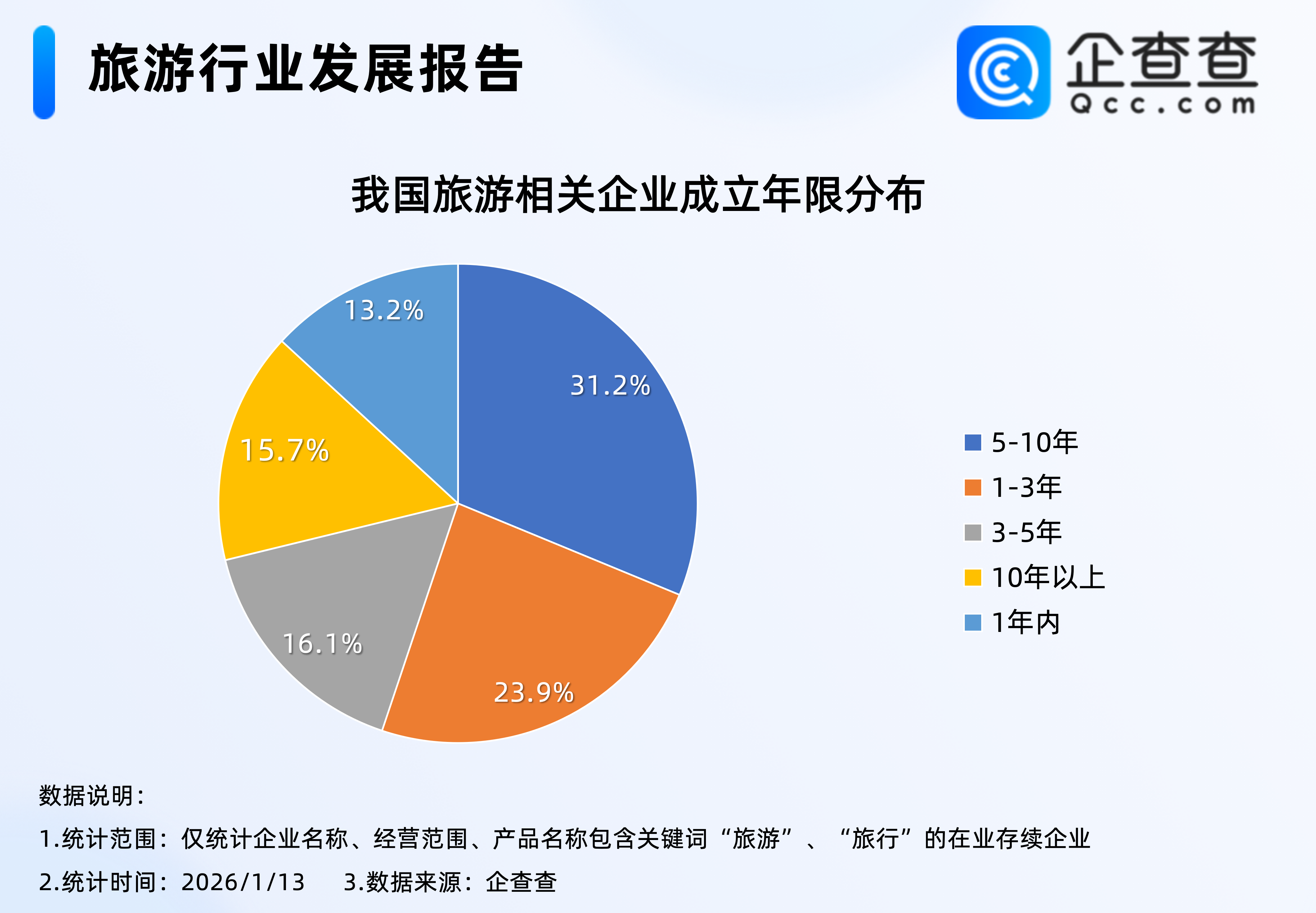 企查查数据显示,截至1月13日,我国现存235万家旅游相关企业,成立年限分布相对均匀,其中成立5至10年之间的企业最多,占比31.2%,其次是成立1至3年之间的企业,占比23.9%。