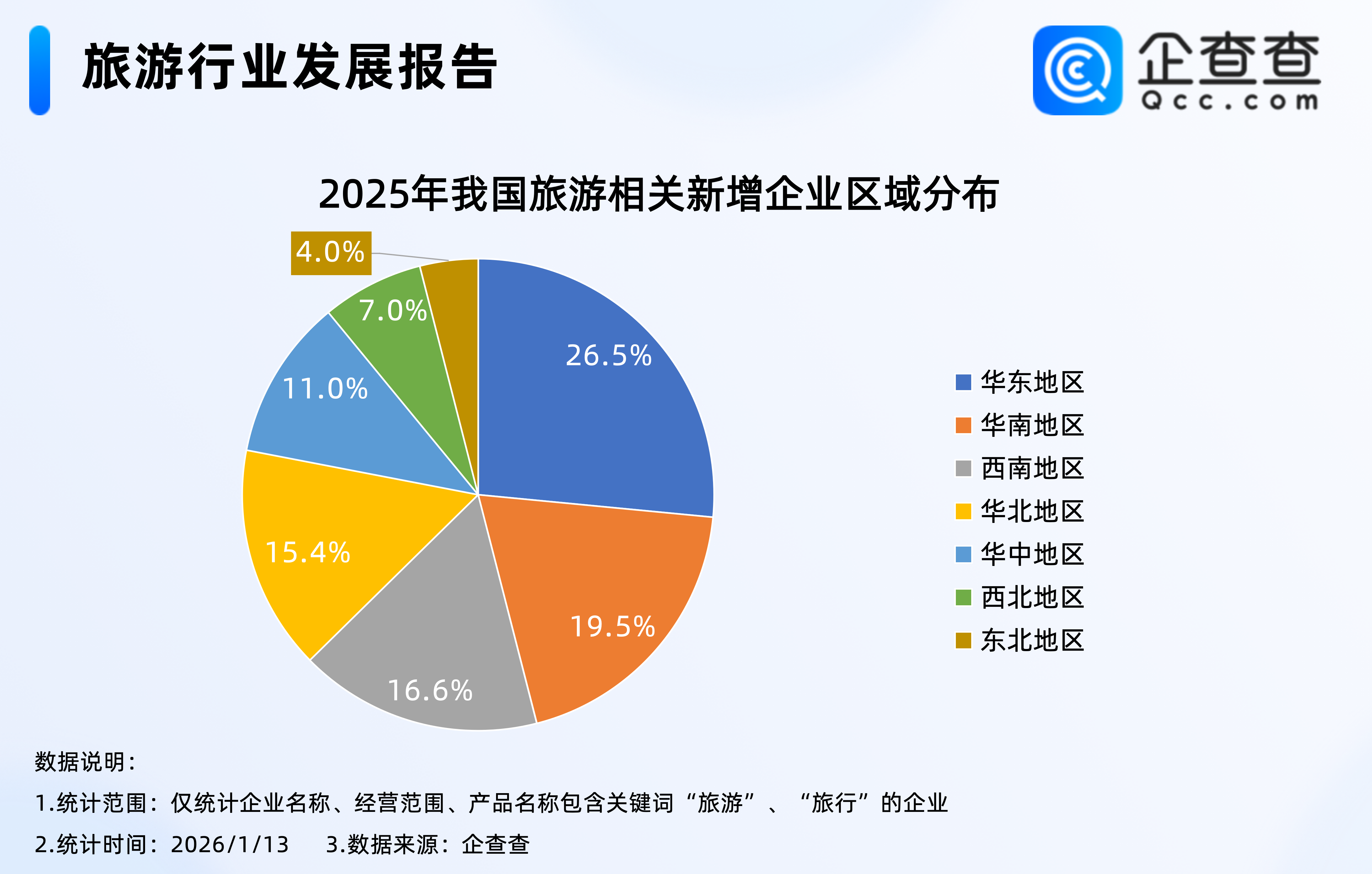 企查查数据显示,2023年-2025年,旅游相关企业每年注册量均超30万家,2023年全年,我国旅游相关企业注册量同比大幅增加43.9%至37.7万家,成为近五年注册量及其增速最大的一年;2025年全年,我国累计注册32.1万家旅游相关企业,与2024年同期基本持平。2.从区域分布来看:华东地区占比26.5%
